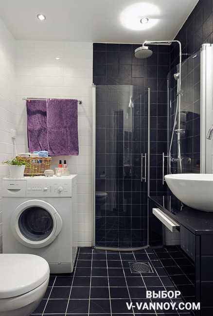 Для того, чтобы черный цвет вышел из моды, наверное, нужно отказаться от всей палитры вообще. Безусловно, он хорош по многим показателям, но в случае с дизайном маленькой ванной комнаты стоит акцентировать внимание на одной маленькой, но существенной детали: его нужно использовать очень осторожно — риск вызвать сильный клаустрофобный эффект уж очень велик. Черный имеет обыкновение немного уменьшать пространство, а в некоторых случаях и провоцировать сильнейшую его компрессию. Приведенные ниже фото демонстрируют, как лучше всего использовать его в случае нехватки квадратных метров.