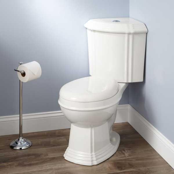 Лучший вариант – использовать угловой компакт-унитаз с треугольным бачком. Тогда соседний угол может занимать биде или.