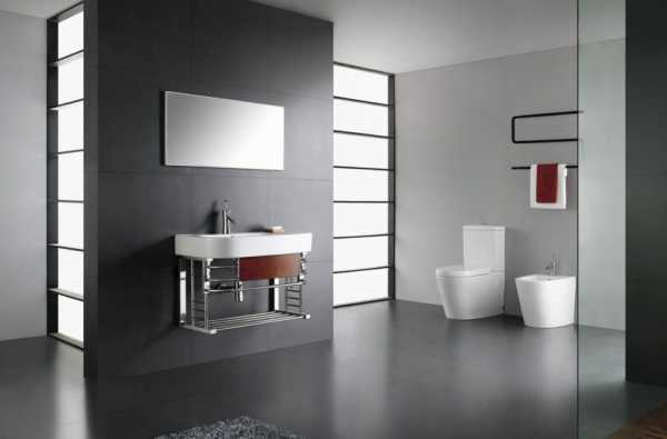 - модульная сантехника и мебель — подвесные унитазы с системой скрытой инсталляции, тумбы и умывальники со строгой геометрией линий и форм;