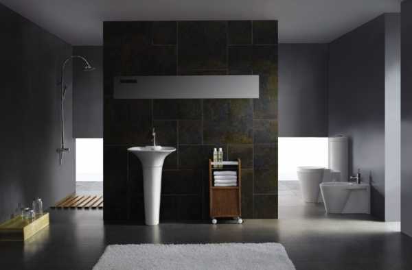 Привычно туалет представляется либо абсолютно белым, как в общественных местах, либо в морских оттенках, как в большинстве квартир. Но в 2018 году дизайнеры предлагают кардинально новое решение: отойти от стереотипов и начать использовать темные цвета: серый, графитовый и даже черный. Главное – дополнить их аксессуарами другого цвета, особенно круто смотрятся сочетания со сдержанной природной гаммой.