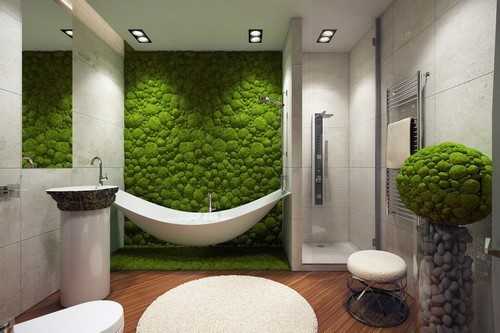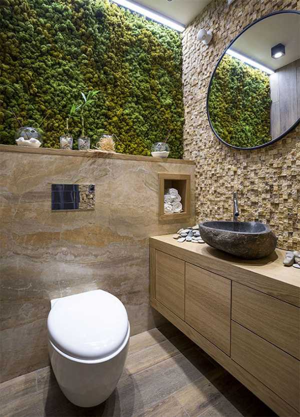 Эко-интерьер туалета – один из трендов 2019. Основная идея дизайна – близость к природе, натуральные и высоко экологичные материалы: каменные и деревянные облицовки, мебель и панели. Если есть возможность, в туалете размещают живые растения, оформляют зеленую стену теневыносливыми вьющимися цветами и папоротником. Мох для отделки туалета будет удачным штрихом дизайна.