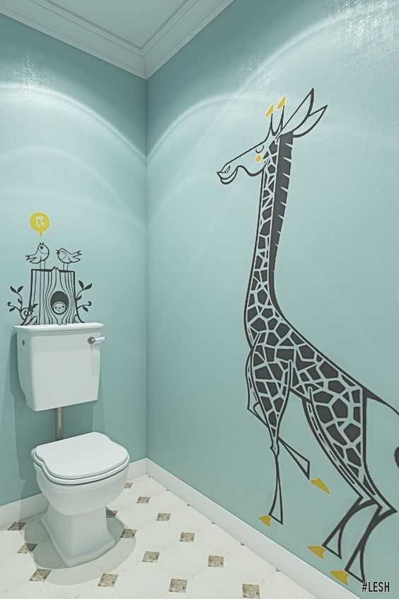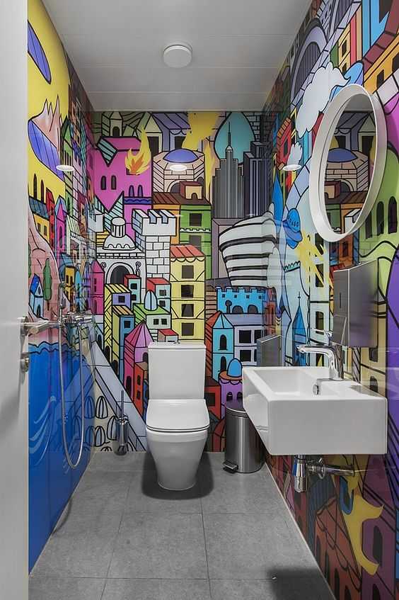 Да, вот именно – долой сдержанный дизайн, особенно если в доме есть дети или креативные молодые люди. Чаще всего рисунки используются на стенах санузлов в барах, но кто сказал, что эту идею нельзя перенести и на квартиру. В поддержку рисункам можно подобрать тематичные аксессуары.