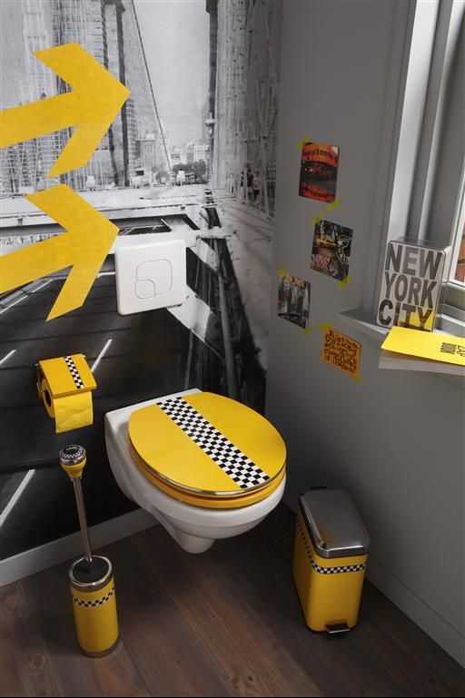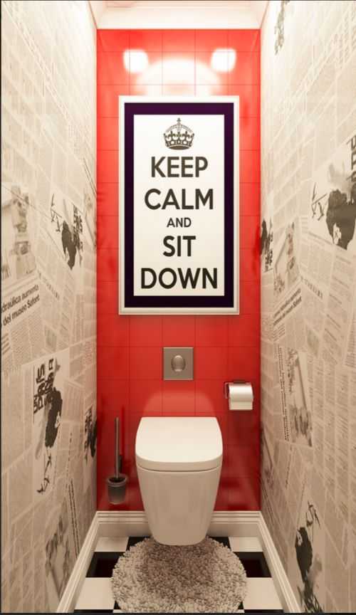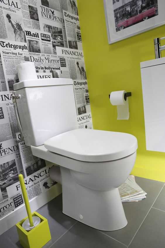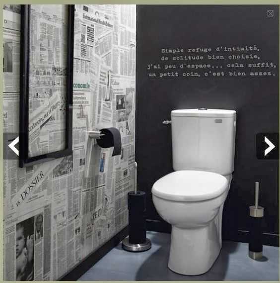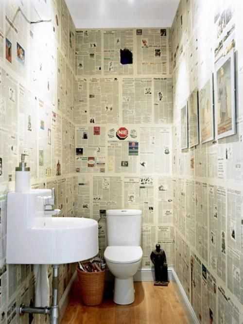 Немало шуток существует о том, что туалет – это место, где можно спокойно почитать газету. Вот и дизайнеры зацепились за эту мысль, только обыграли ее с неожиданной стороны – газетами предлагают украшать в санузлах стены. Отлично будет выглядеть с краской контрастных цветов: белой, черной либо любым другим насыщенным тоном.
