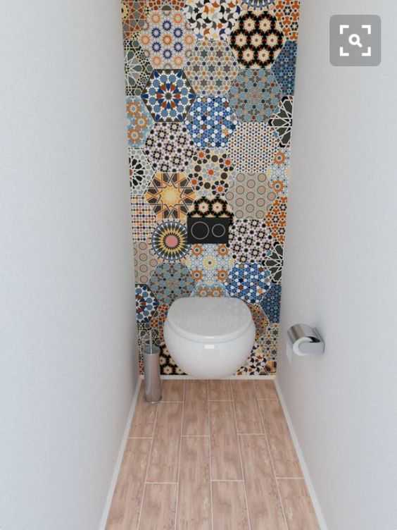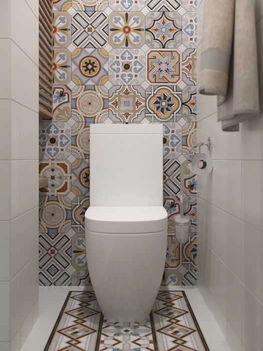 Если вам не по душе светлый санузел, добавить красок дизайну помогут яркие акценты. Это может быть плитка с рисунком или узором. Ее стоит использовать на стене за унитазом. От идеи использовать мозаику на стыке двух материалов лучше отказаться.
