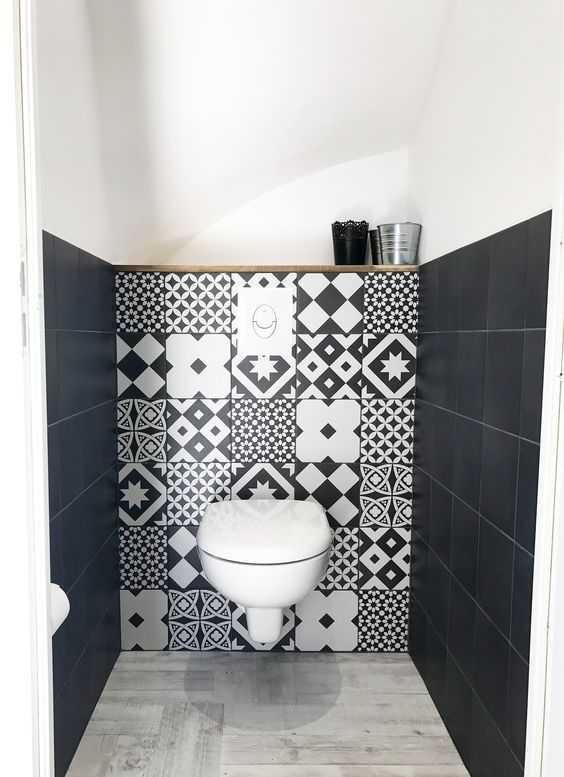 Еще один модный и практичный ход – выложить стены плиткой только до середины. Это позволит не перегрузить пространство, но в то же время обеспечит легкий уход за ним. Кстати, обратите внимание на черно-белые модели: так вы поддержите сразу несколько трендов 2018 года: на испанскую плитку, монохром и темные тона в дизайне туалета.