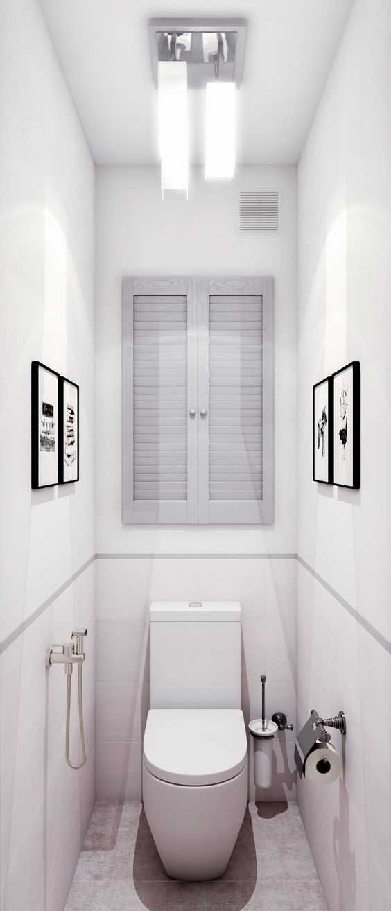 Как известно, светлые цвета отражают больше света, поэтому способствуют визуальному увеличению пространства. Белый, бежевый и серый отлично подойдут для того, чтобы оформить интерьер маленького туалета.