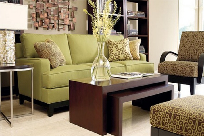 ЗеленыйДругим дополнительным цветом для коричневого является зеленый. Конечно, разные оттенки зеленого по-разному влияют на настроение комнаты. Добавление зеленой мебели может стать фокусом дизайна интерьера гостиной, выделяясь на фоне коричневых элементов.
