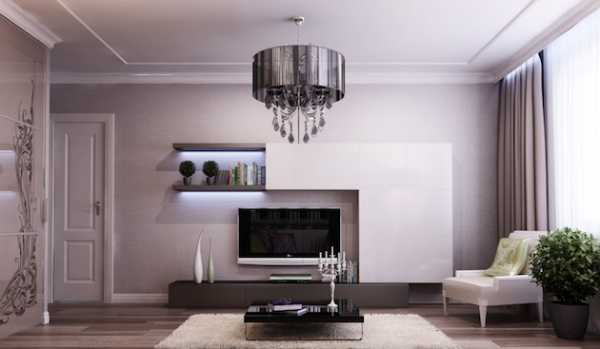 - Современный интерьер зала в однокомнатном жилище или в «хрущевке» с одной комнатой