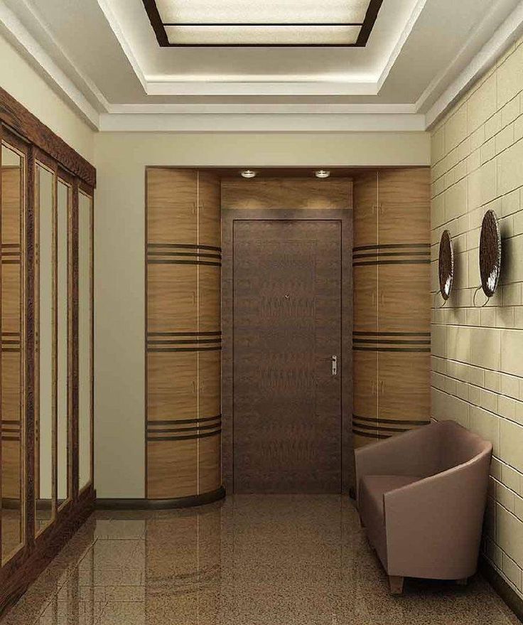 Прихожую можно обозначить разным уровнем потолка, у входа повесить компактную люстру круглой формы или разместить вдоль длинной стены шкаф-купе.