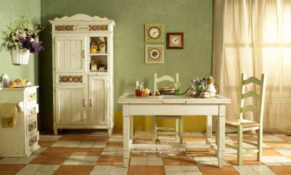 Цвет фасадов – кремовый, лавандовый, нежно-зеленый, белый, коричневатый и светлого дерева. По поверхности мебели могут быть пущены цветочные росписи.