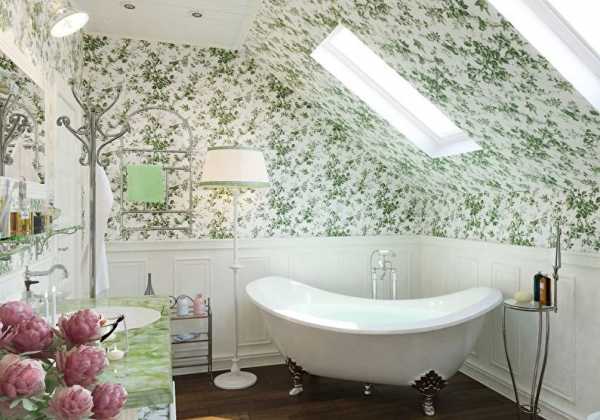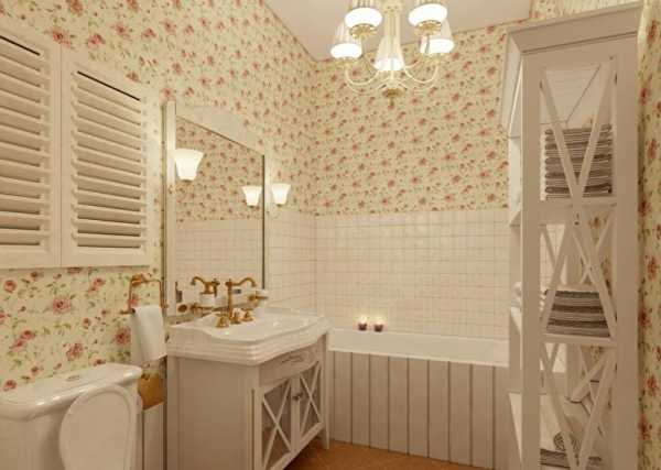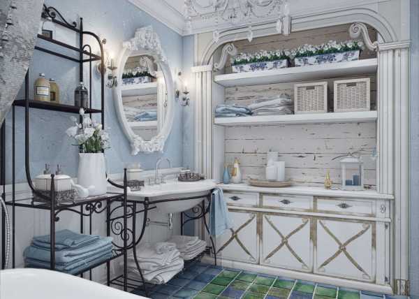 Изюминка ванной в этом стиле – наличие оконного проема. Пусть окошко будет небольшим и вид из него откроется на российские поля, а не на французские виноградники. Все равно оно должно быть. Еще одна важная деталь в оформлении санузла – ванна на ножках, установленная не у стены, а по центру. Вполне уместно поставить рядом пуф или небольшое кресло из ротанга, плетеную корзину для белья. Стены и пол отделываются матовой или глянцевой плиткой с цветочными узорами или в морской тематике.