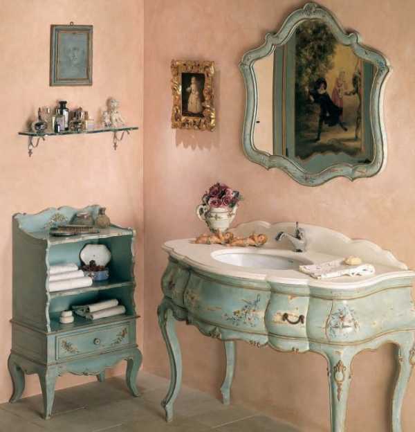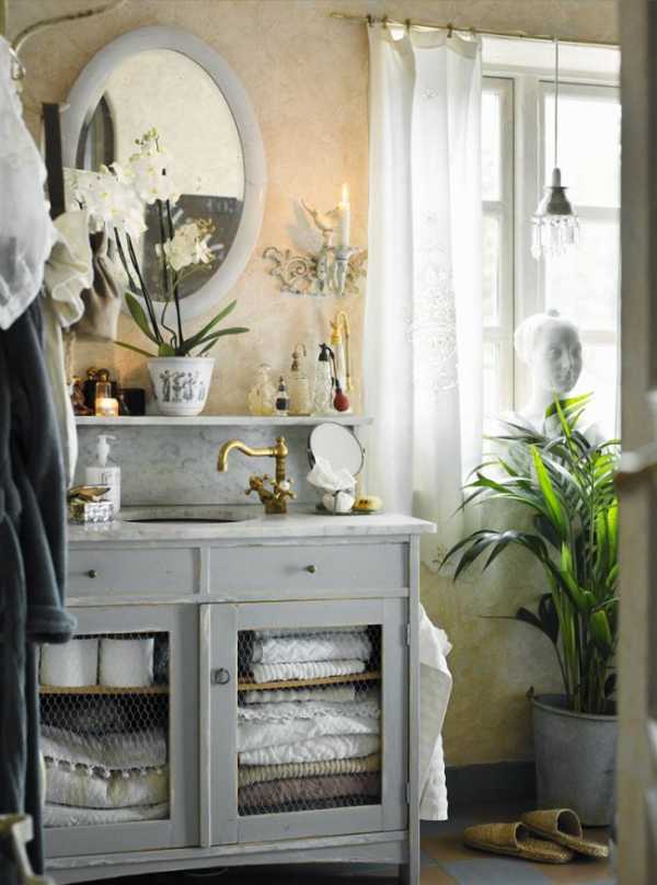 Прованс – это тот стиль, который даже в ванной предполагает вазы и кашпо с цветами. А еще здесь можно установить красивый кованый подсвечник и большое зеркало в старинной, патинированной раме. О том, какие выбирать цвета, говорилось выше.