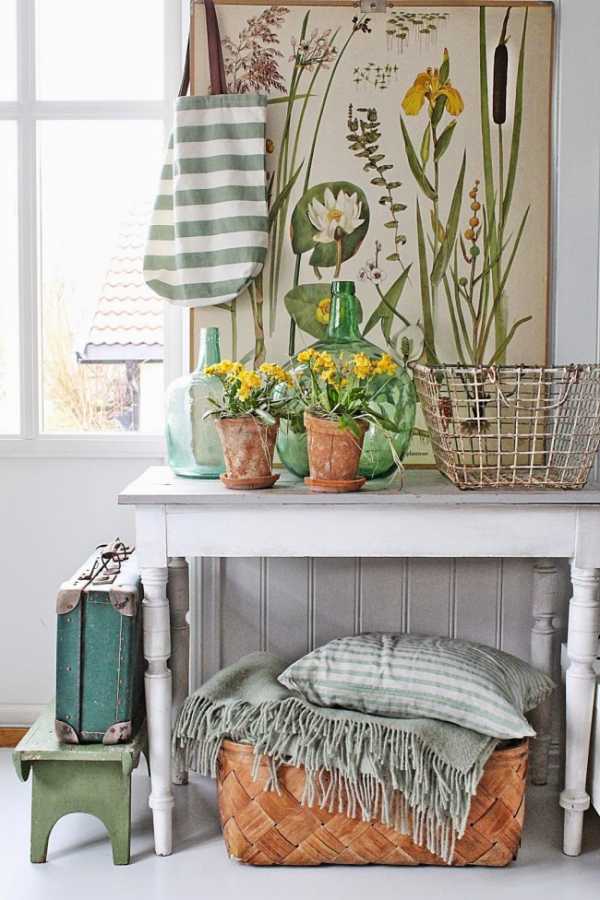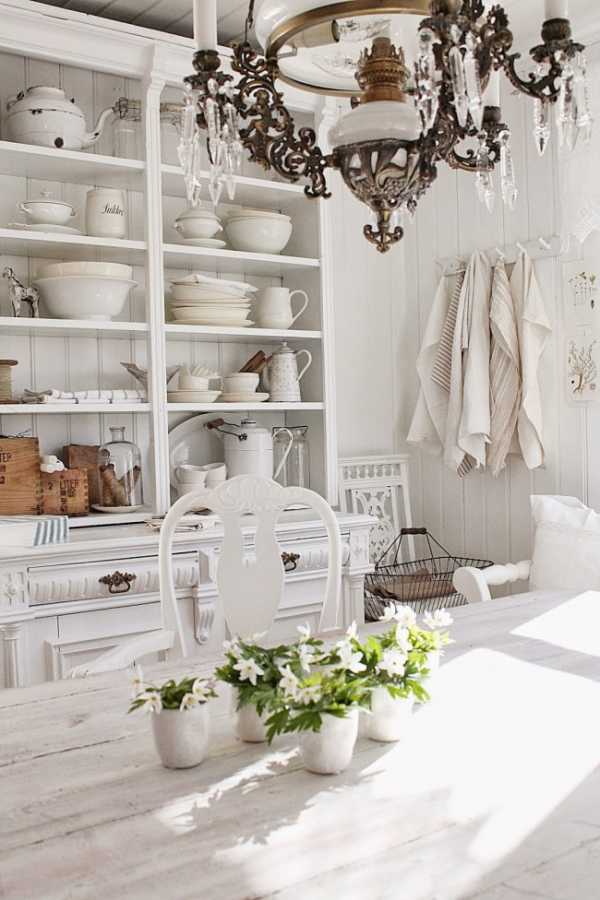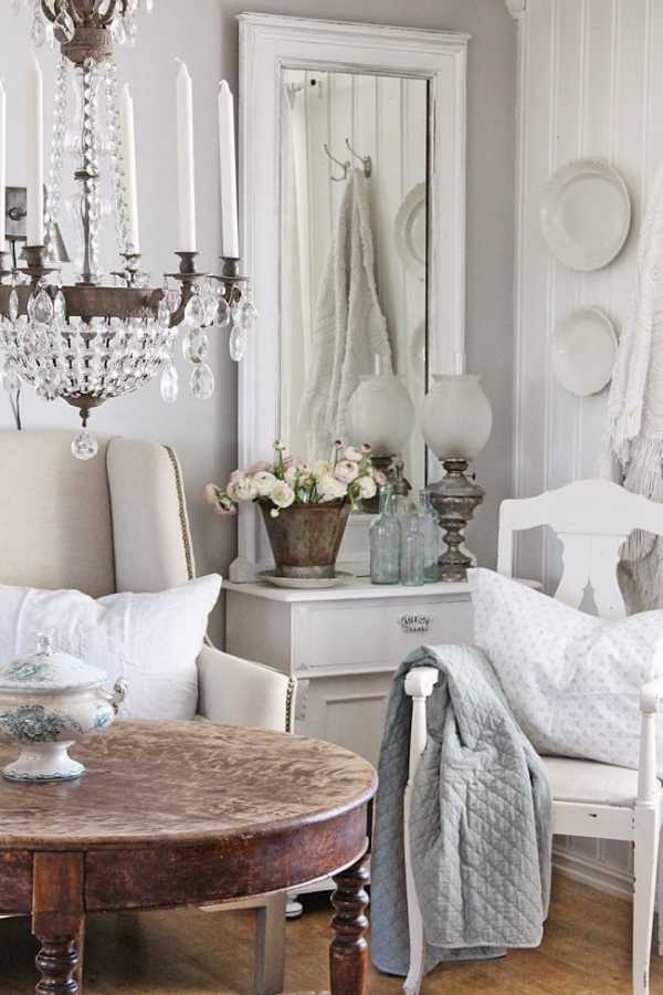 О цветах и оттенках уже говорилось выше. Все они должны быть светлыми, пастельными, словно припорошенными пылью или выгоревшими на солнце. Не стоит в одном помещении комбинировать много разных оттенков. Лучше использовать белый или молочный как базовый и дополнять его разными оттенками коричневого, оливкового или серо-голубого.