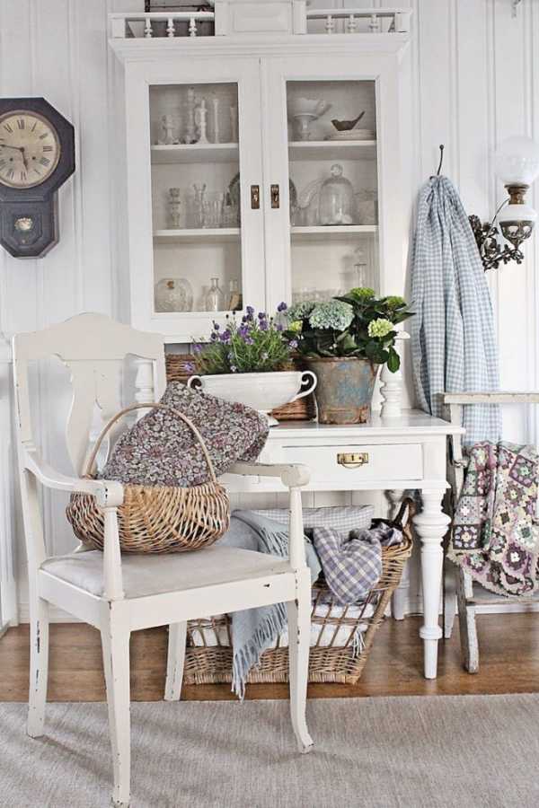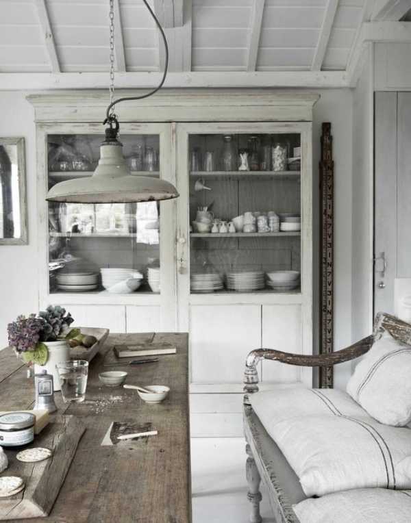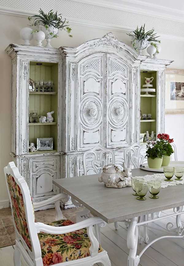 При невозможности обставить дом мебелью из настоящего массива, поищите в чуланах и на чердаках старые шкафы, столы, стулья и другие предметы. Часто подобную мебель за бесценок можно приобрести по газетным объявлениям. Не совсем подходящую по окраске мебель можно передекорировать, а слишком облупившиеся поверхности слегка отреставрировать. Занимаясь данным процессом, помните, что в подобном интерьере светлым должно быть все, в том числе и мебельные поверхности, так что забудьте про морилки и полировку.