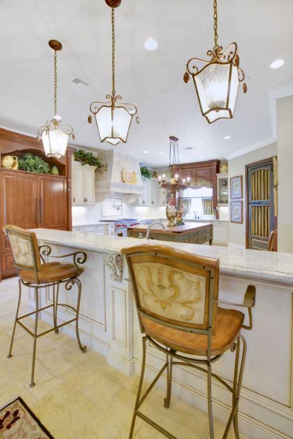 Люстры и бра. Очень красиво, богато и в соответствии со стилем смотрятся тяжелые люстры на несколько лампочек из кованого железа. Обычно они имитируют подсвечники. Такие же бра на одну-две лампы можно повесить на стены.