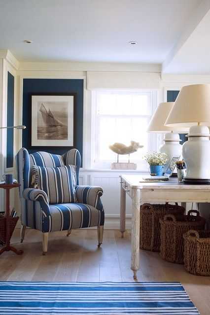 Можно попробовать добавить в декор морскую тематику – она также актуальна для стиля прованс. Украсьте комнату рыбацкой сетью, фигурками морских птиц, ракушками, морскими звездами. В прованском интерьере с морским уклоном используется полосатый бело-синий текстиль. Особенно актуально такое решение для ванных.