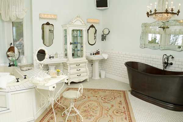 Из всех домашних комнат меньше всего затрат и внимания уделяется ванной. В ней стиль не выглядит романтично или изыскано, он скорее практичен. Грубо выкрашенные в белый стены (другие цветовые изыски здесь практикуются редко), дощатый пол, скромное окошко – вот типичный вид комнаты для гигиены в данном направлении. Стиль прованс проявляет свое присутствие исключительно в аксессуарах. О нем говорят старинные полки, фарфоровые кувшины, разложенные прямо на полках полотенца и салфетки.