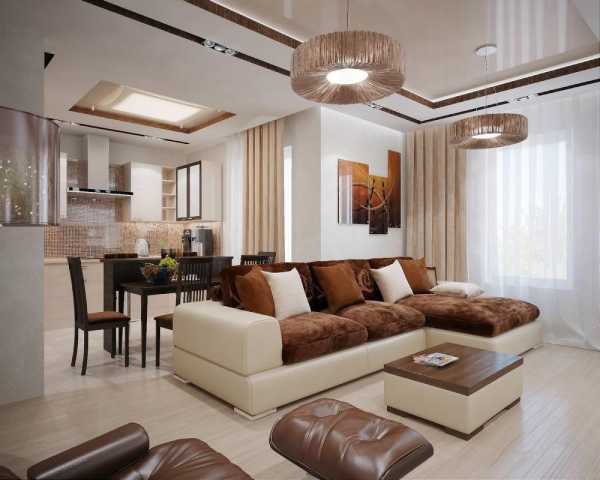 Шоколадный цвет в интерьере гостиной с совмещенной кухней