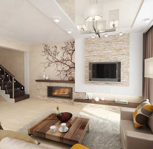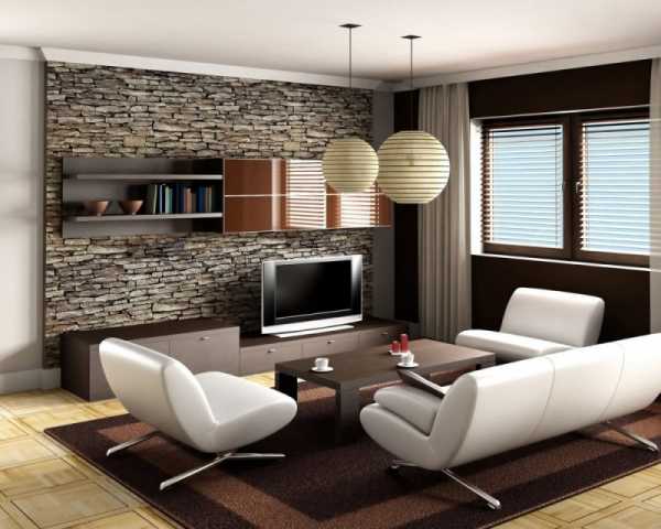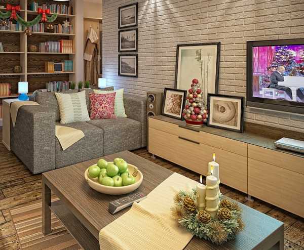 Еще приведем пример декора в не стандартном оттенке. Серо-коричневый цвет кладки придает благородства и весомости гостиной.