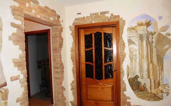 Очень красиво будет смотреться на стенах вариант фрагментной укладки. Вся суть укладки заключается в том, что камень на стене укладывается отдельными фрагментами, а покрытие на остальной части стены является только фоном для камня. На этой поверхности можно наклеить обои, сделать рисунок или просто покрасить стену лаком. Такая укладка способна отобразить некую динамику в интерьере, подчеркивая оригинальность и индивидуальный стиль помещения. Таким образом, благодаря такому виду укладки кирпича вы сможете защитить углы арочных проёмов и углы стен, которые, как правило, больше всего подвержены загрязнению.