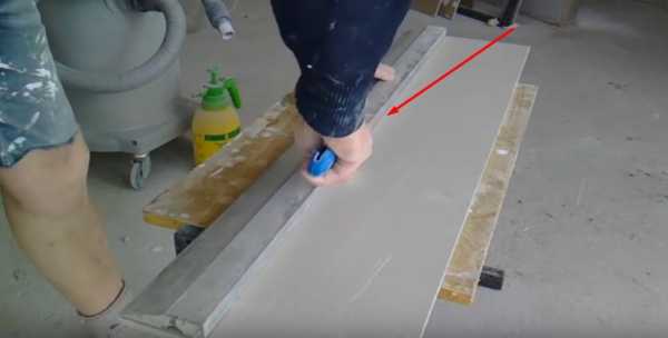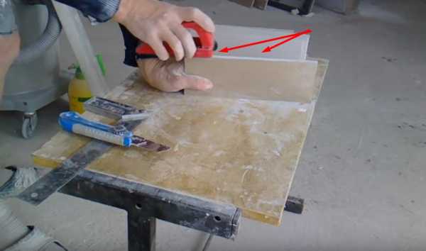 Разметка на гипсокартонеЗатем разрезаем канцелярским ножом. Когда нужное количество будет готово, каждый кирпичик нужно по краям отшлифовать. Это нужно для того, чтобы выровнять край.