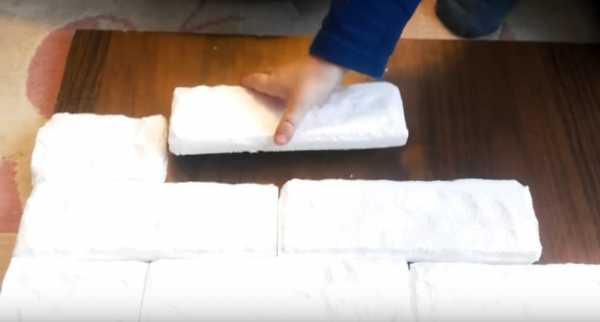 Для начала на пенопласте делаем отметки кирпичиков, потом их вырезаем ножом.