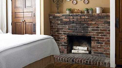 Самодельный каминИспользование кожаной обивки в интерьере в сочетании с белым цветом стен, очень гармонирует с каминной стеной, сделанной из красного «кирпича».