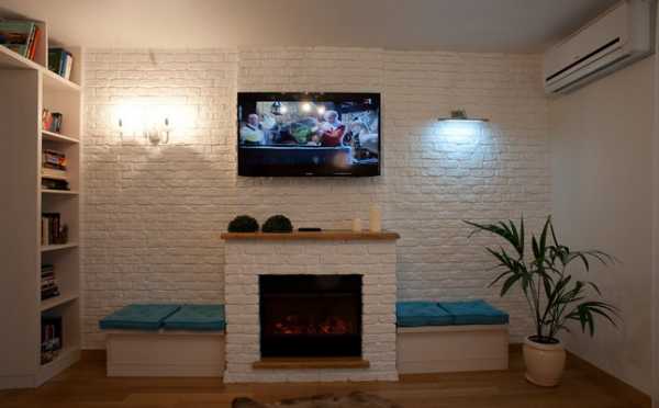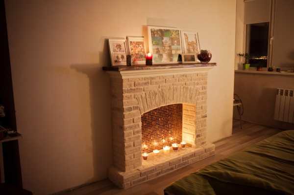 Камин с эффектом обожженного кирпичаДекоративный камин довольно несложно изготовить в домашних условиях. На нижнем фото, как раз самодельный камин.