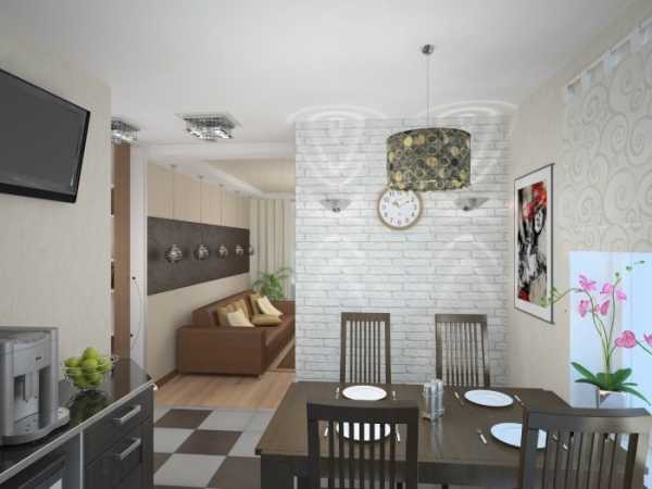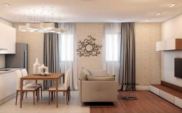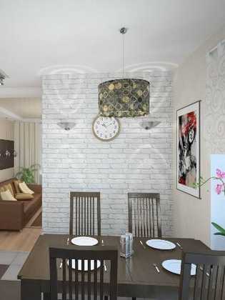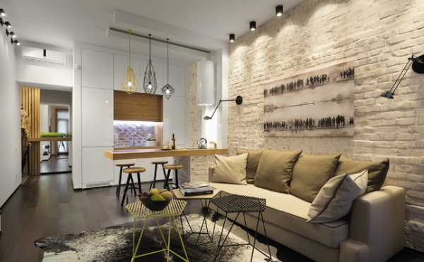 Если гостиная совмещена с кухней, представляя собой комнату-студию, с помощью такого приема, как кирпичная стенка, можно выделить зону для отдыха, приготовления пищи, а также семейной трапезы.