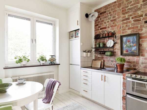 Еще один смелый интерьер, когда кухонный фартук заменяет ПВХ — панель с имитацией кирпича.