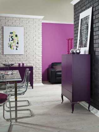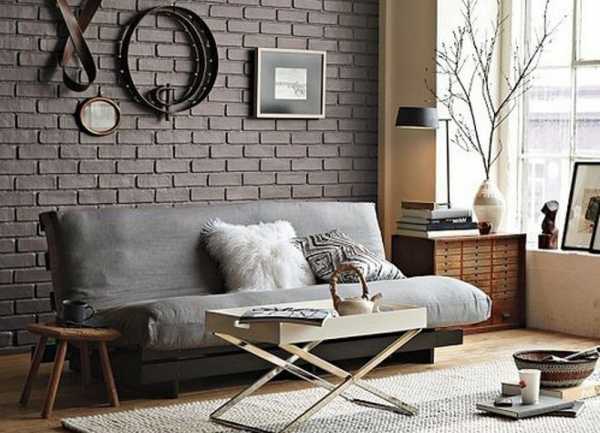 Этот вариант отделки достаточно сложен, поскольку требует соблюдения не только стилевого, но и цветового единства со всеми предметами обстановки и другими деталями интерьера. Легче всего в этом случае работать с серым декоративным кирпичом для внутренней отделки, который гармонирует практически со всем спектром цветов. В данном этот материал сероватых тонов придает комнате особое изящество, хорошо сочетаясь как с мебелью нейтрального пепельного оттенка, так и с ярким малиновым ковром на полу.