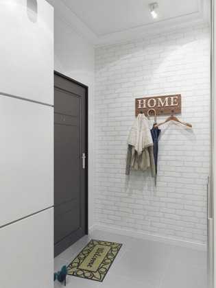 Белый кирпич в прихожейСветлый белый кирпич отлично гармонирует с общим серым тоном всех остальных стен, как на фото.