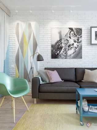В данном случае декоративный кирпич в интерьере, окрашен в белый цвет и используется как фон для яркой мебели: это дизайнерское решение выглядит оригинальней и выразительней обычных гладких стен, что позволяет помещению «заиграть».