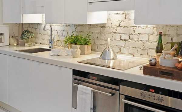 Кирпич белого цвета великолепно выглядит в комбинации с современной кухонной техникой и мебелью.