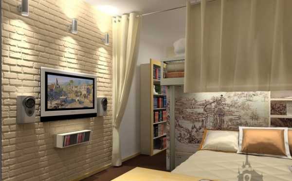 Часто при дизайне помещения, выполняющего функции спальни и рабочего кабинета одновременно, для его зонирования используется кирпичная кладка.