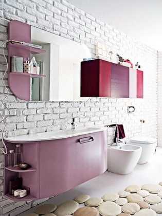 Применение кирпичной стенки при дизайне ванной комнаты позволит избежать безликости и скучности помещения.