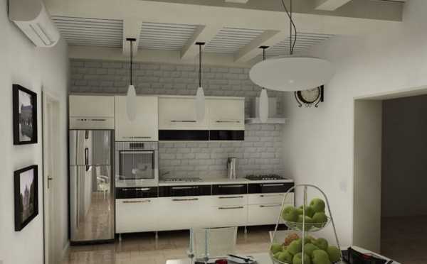 В просторных кухнях роскошно смотрятся кирпичные потолки, отделанные материалами, имитирующими этот природный камень.