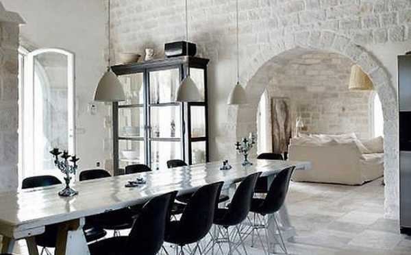 Белая кирпичная стена прекрасно смотрится в сочетании со штукатуркой или стеклом, с хромированными и металлическими изделиями.
