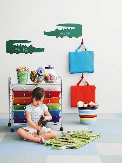 Пространство для игр должно быть безопасным и легко подаваться уборке. Для этого расположите в ней достаточное количество ящиков для игрушек, при необходимости постелите ковер с низким ворсом, который легко подается чистке.