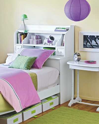 - В интерьере комнаты для девочки-подростка огромное значение имеет хранение одежды и всевозможных аксессуаров. Так что, если комната небольшая, можно повесить на дверь вешалку с крючками для курток и школьного рюкзака. А подвесные модули со множество отделений можно приспособить под личные вещи, которыми ваша дочь пользуется чаще всего. Все лишнее: сезонную одежду, диски с фильмами, спортивный инвентарь можно убрать под кровать, установив одинаковые тканевые или картонные коробки. А в изголовье кровати поставить приставной столик-консоль, куда удобно складывать самые ценные вещи. Такой дизайн комнаты для подростка девочки будет функциональным и практичным.