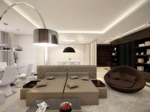 Другим методом является зонирование при помощи освещения. Интерьер гостиной с зонами разного дизайна будет эффектно смотреться при использовании нескольких вариантов освещения.