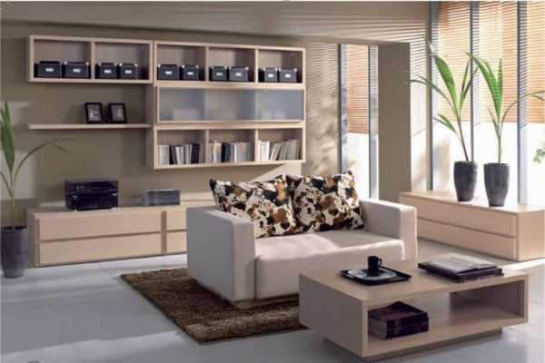 Для минималистской гостиной нужно подбирать простую, вместительную конструкцию шкафов, геометрически правильные диван и кресла. Не нужно нагромождать интерьер множеством полок, тумбочек и стульев.