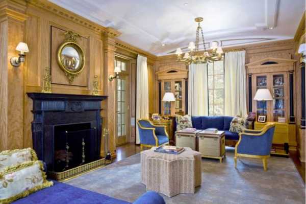 В гостиной должен быть шкаф с книгами. Замечательно, если роль телевизора в интерьере заменит рояль или камин. Большая хрустальная люстра наполнит пространство светом, ковер добавит уюта.