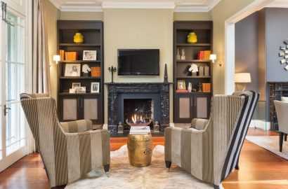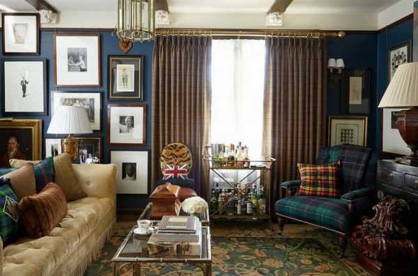 В интерьере гостиной требует тщательного подбора деталей, мебели высокого качества и элементов отделки. Подходит для создания домашней атмосферы и традиционного стиля. Дерево, клетка, цветочные узоры, кожаные диваны «честерфилд», кресло-бержер, камин, книжные полки, массивные комоды подходят для большой комнаты и воссоздания интерьера.