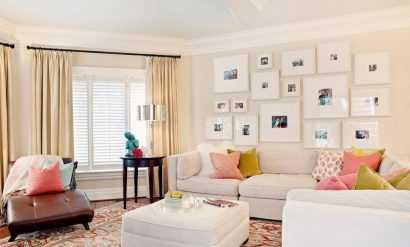 Из декора нужно обратить внимание на наличие зеркала, настенного декора (рамок и односложных картин), люстру простой конструкции, диванных подушек. Яркий или однотонный ковер и классические портьеры принесут тепло в современный интерьер. Текстиль в гостиной должен быть максимально естественным, и без наслаивания текстур.