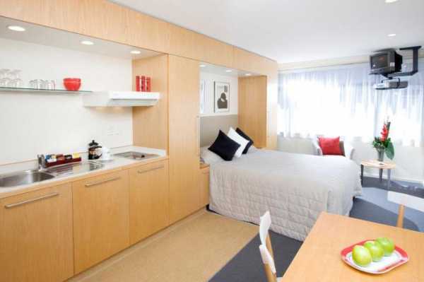 В спальную зону рациональным решением станет приобретение откидной или трансформирующейся кровати. Неплохим решением может стать организация в изголовье системы хранения. Небольшая гардеробная способна существенно оптимизировать небольшое пространство.