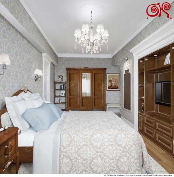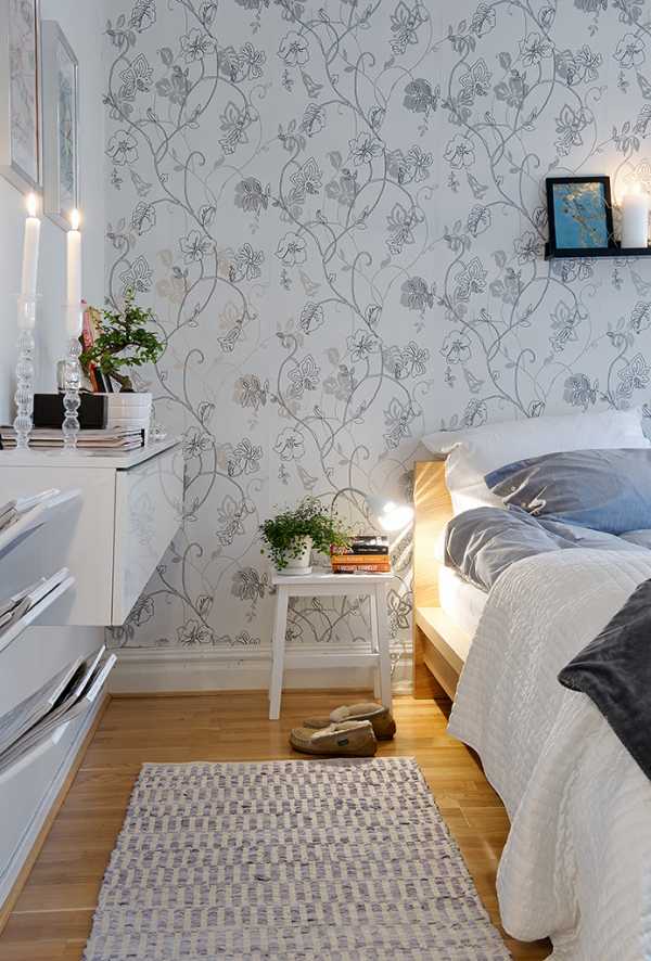 Обои для спальни в хрущевке лучше выбирать светлые, пастельные, с мелким неярким рисунком и светоотражающими деталями. Полностью глянцевое полотно выявит все неровности стен, а вот комбинация матового фона и зеркальных узоров — наоборот, скроет их.