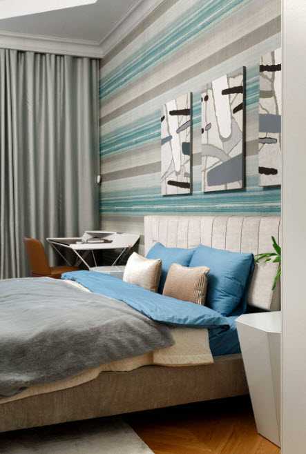 Если вы решили использовать принт в качестве акцента для выделения одной из стен спальни, то остановите свой выбор на геометрическом рисунке или абстракции. Например, полоска вновь стала использоваться для визуального расширения пространства. Горизонтальная полоса зрительно увеличит ширину комнаты, вертикальная – ее высоту.