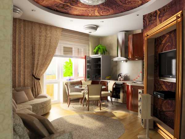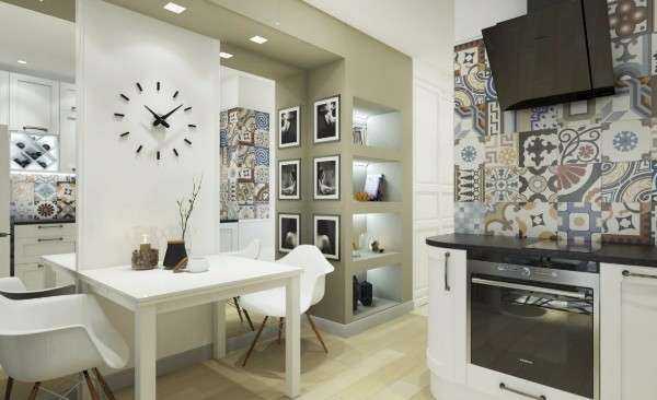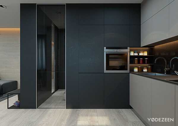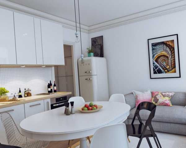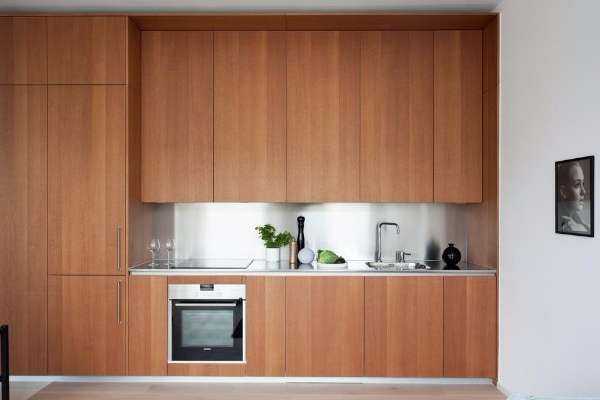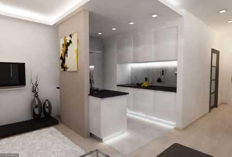 Поскольку кухня в маленьких квартирах студиях, как правило, совмещена с гостиной, то важно оформить её дизайн такими образом, чтобы она стилистически являлась продолжением зала. Отдавайте предпочтение вместительным встроенным шкафам и бытовой технике, чтобы зона кухни выглядела как можно аккуратнее и не сильно привлекала внимание. Её оформление не должно мешать человеку отдыхать и расслабляться в области гостиной.