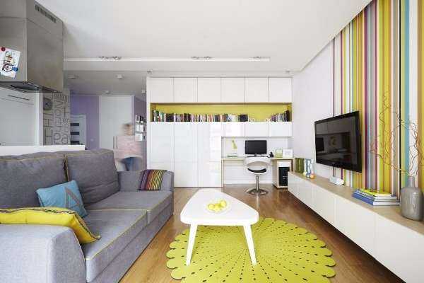 Дизайн проект маленькой квартиры студии может включать в себя объединение комфортной гостиной зоны и зоны отдыха. Гостиная имеет большую площадь, в отличие от других зон. Мебель должна быть функциональной, компактной и при этой красивой. Кровать можно заменить раскладывающимся диваном. Идеи лучше реализовывать постепенно.